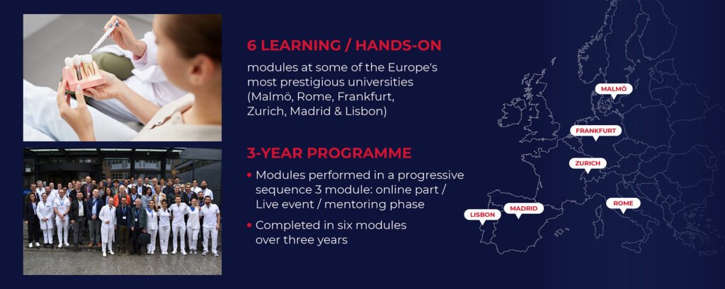 - Each of the modules includes a three-day on-site training element and combines hands-on elements, lectures, practicals and live surgery, hosted at some of Europe’s most prestigious universities.