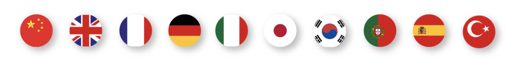 Chinese, English, French, German, Italian, Japanese, Korean, Portuguese, Spanish, Turkish